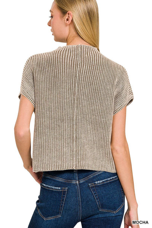 Washed Mock Neck Short Sleeve Cropped Sweater