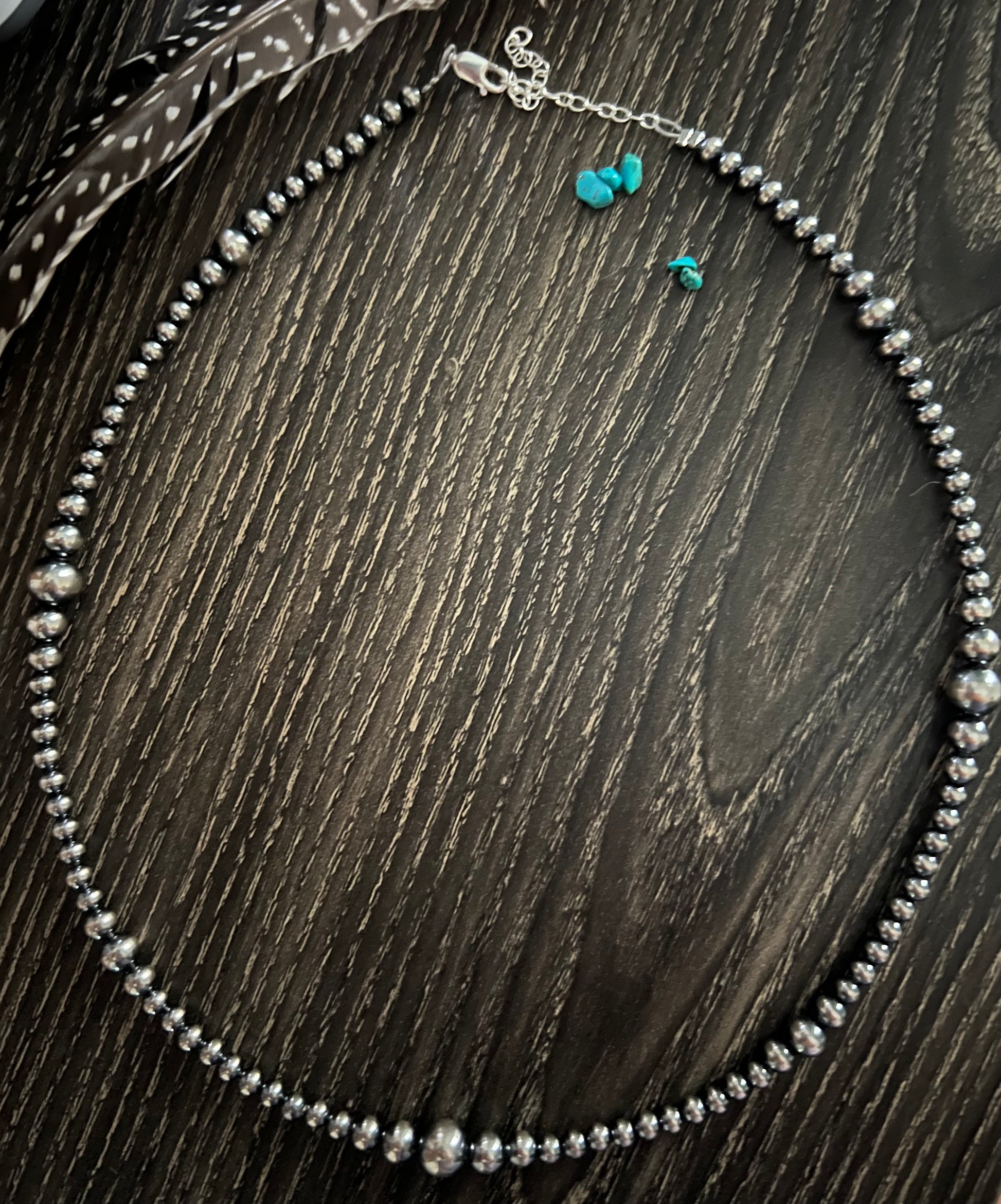 18” with 3” extender, 4,6 and 8 mm sterling pearls