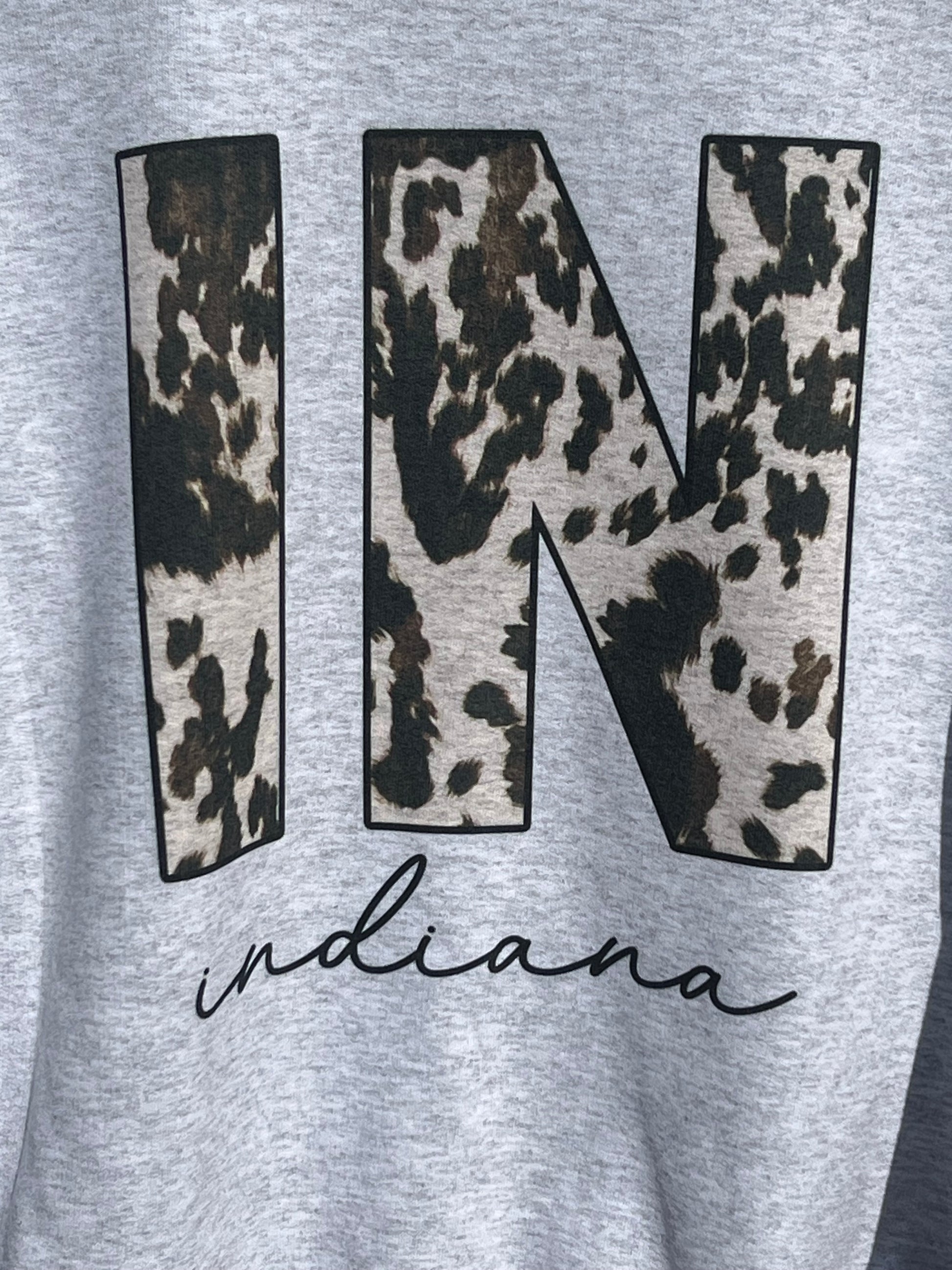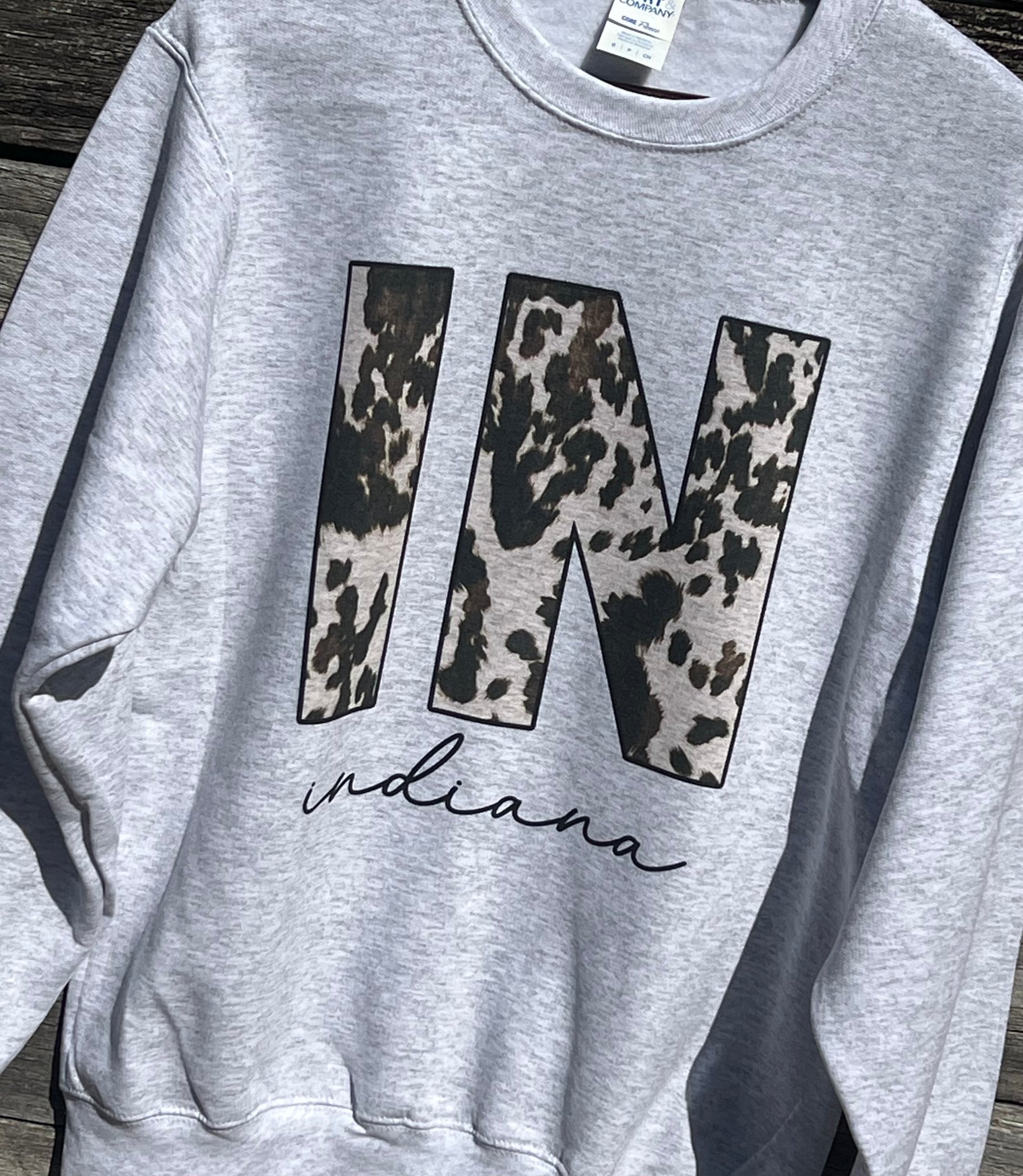 Who doesn't LOVE a good state graphic!? State of Indiana cow print crew Port and Co: Ash Professionally Sublimated 50 Cotton/50 Polyester Unisex and True to Size