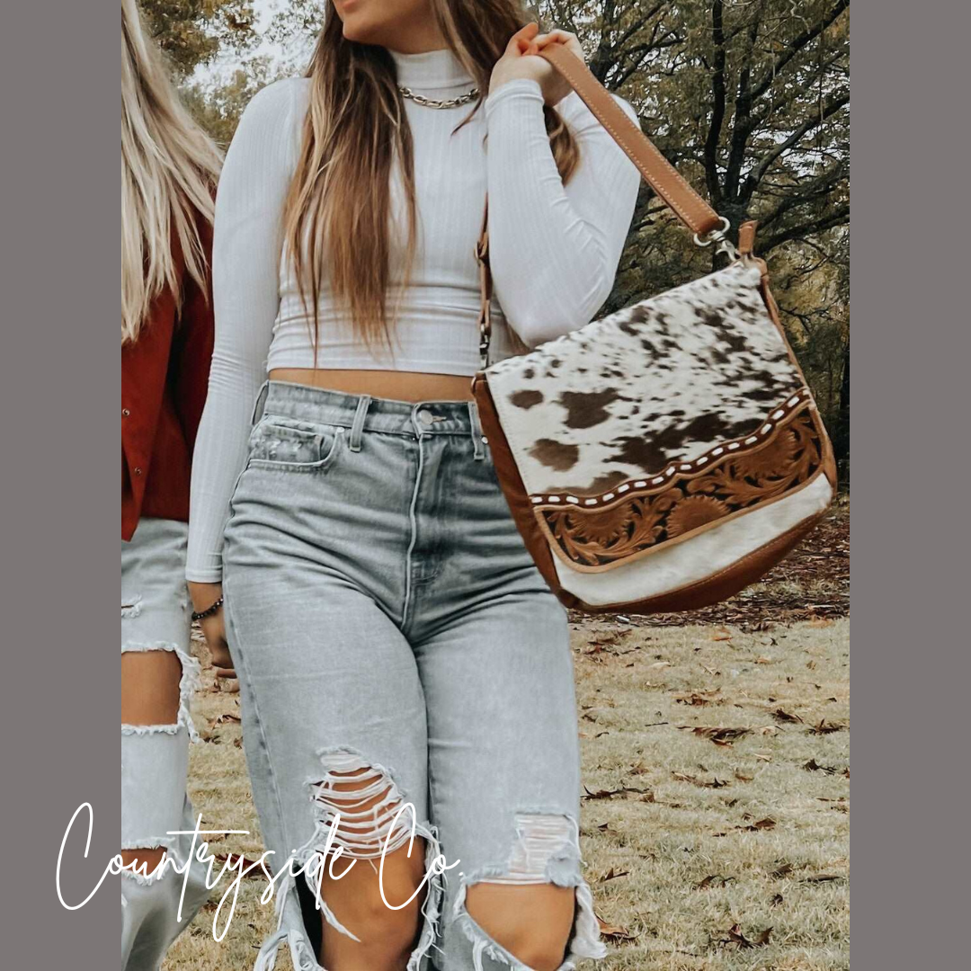 The latest trend in luxury handbags, featuring exquisite hand-tooled leather and cowhide with a built-in back pockets on back. Elevate your fashion game with this high-end bag, complete with an adjustable leather shoulder strap for a personalized fit. It has an interior zipper pocket, and both a zipper closure and flap magnetic closure. measures 10.5x12x3.5 inches.