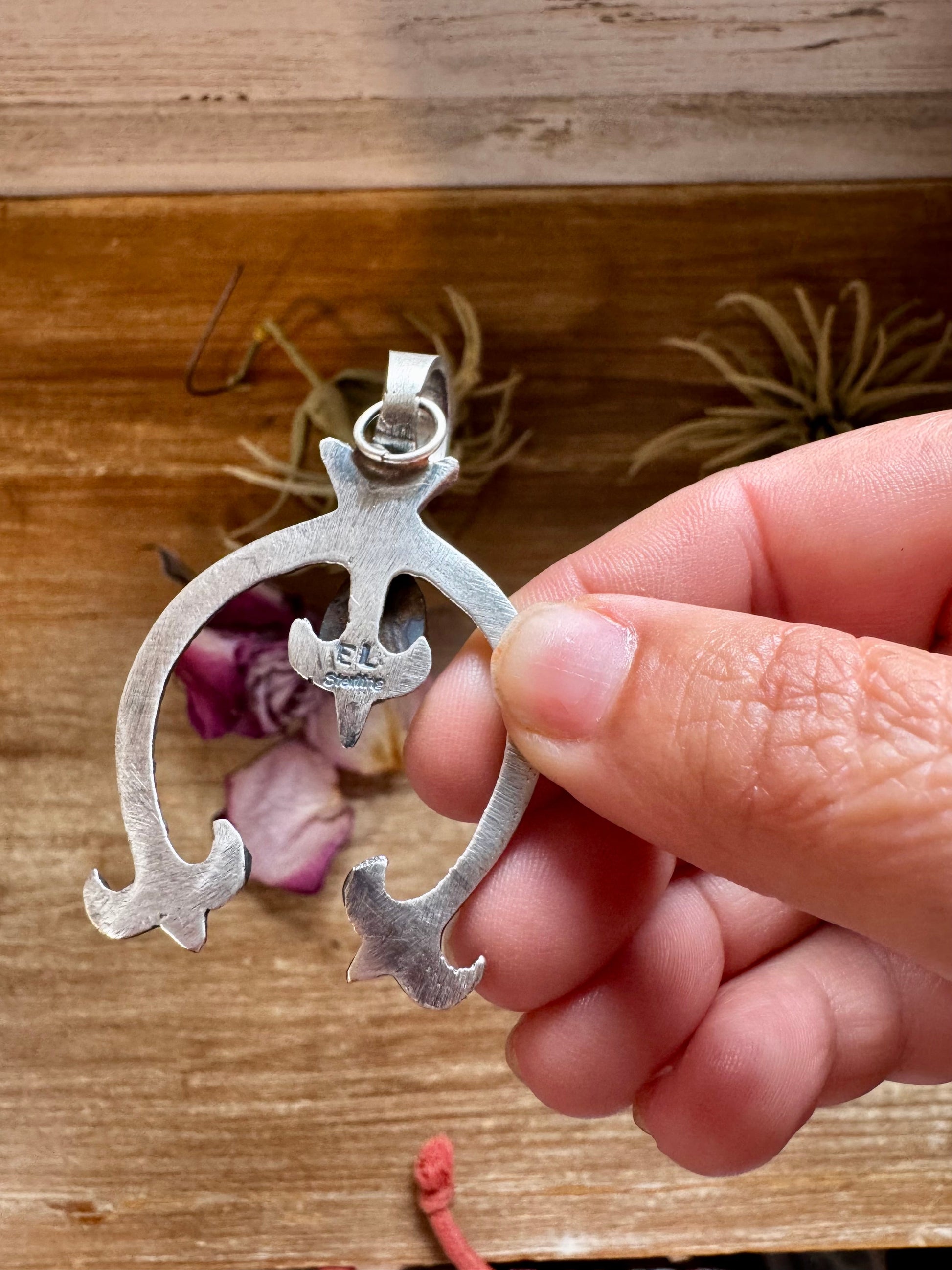 Handmade in the USA, this sterling silver Naja pendant features detailed silverwork with a genuine turquoise stone set at the center. Stamped EL for authenticity, it is crafted with traditional Native artistry. The bail fits up to 8mm pearls, making it perfect for pairing with a sterling silver pearl strand or layering with other turquoise pieces.