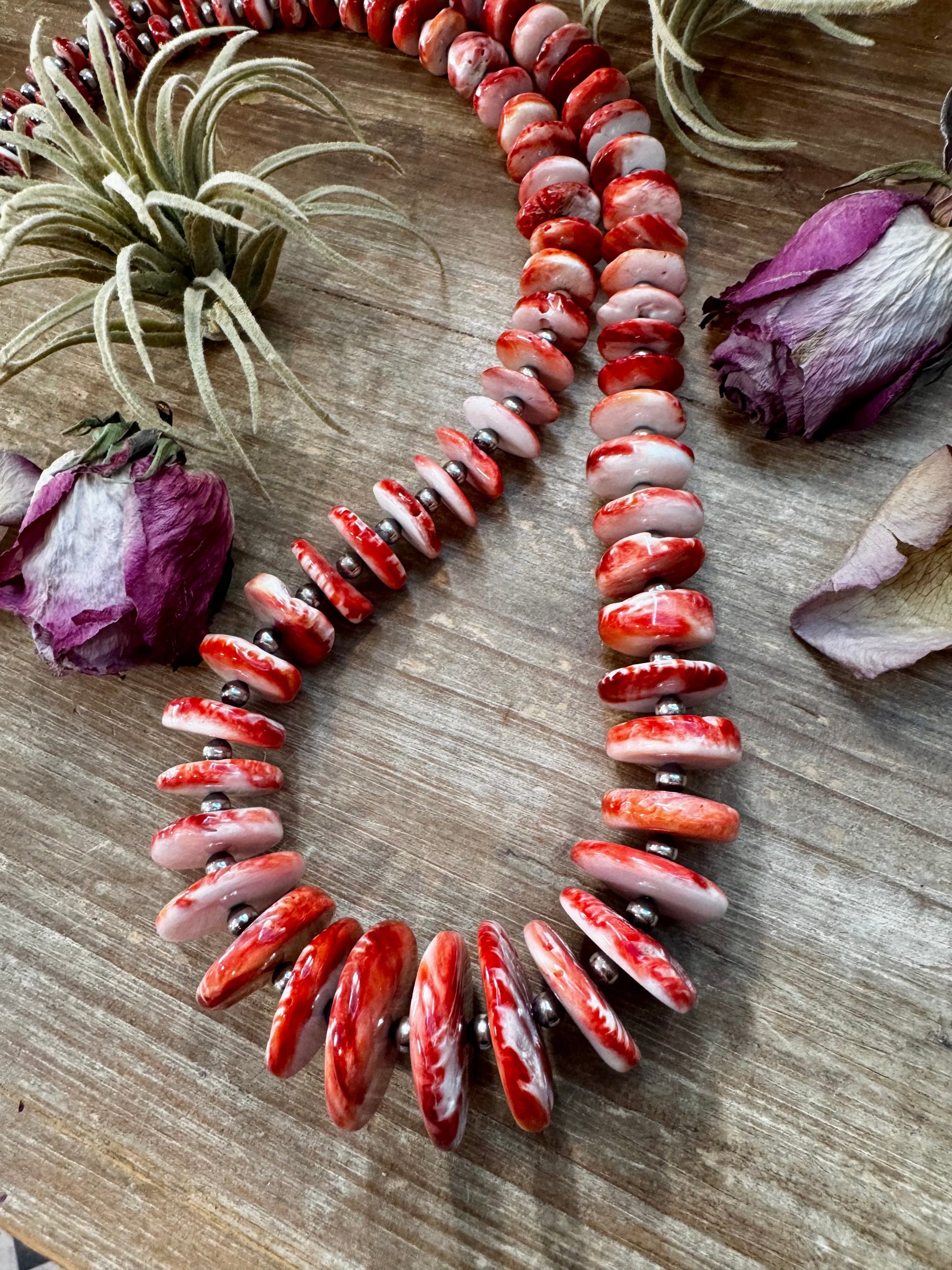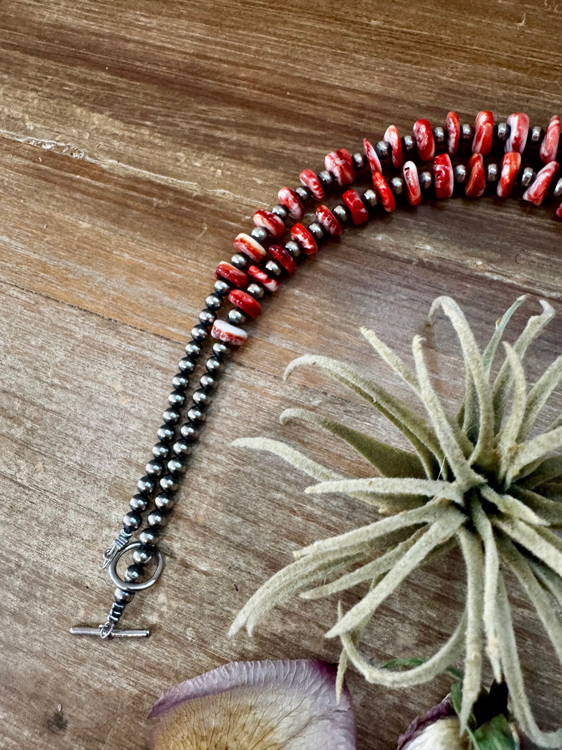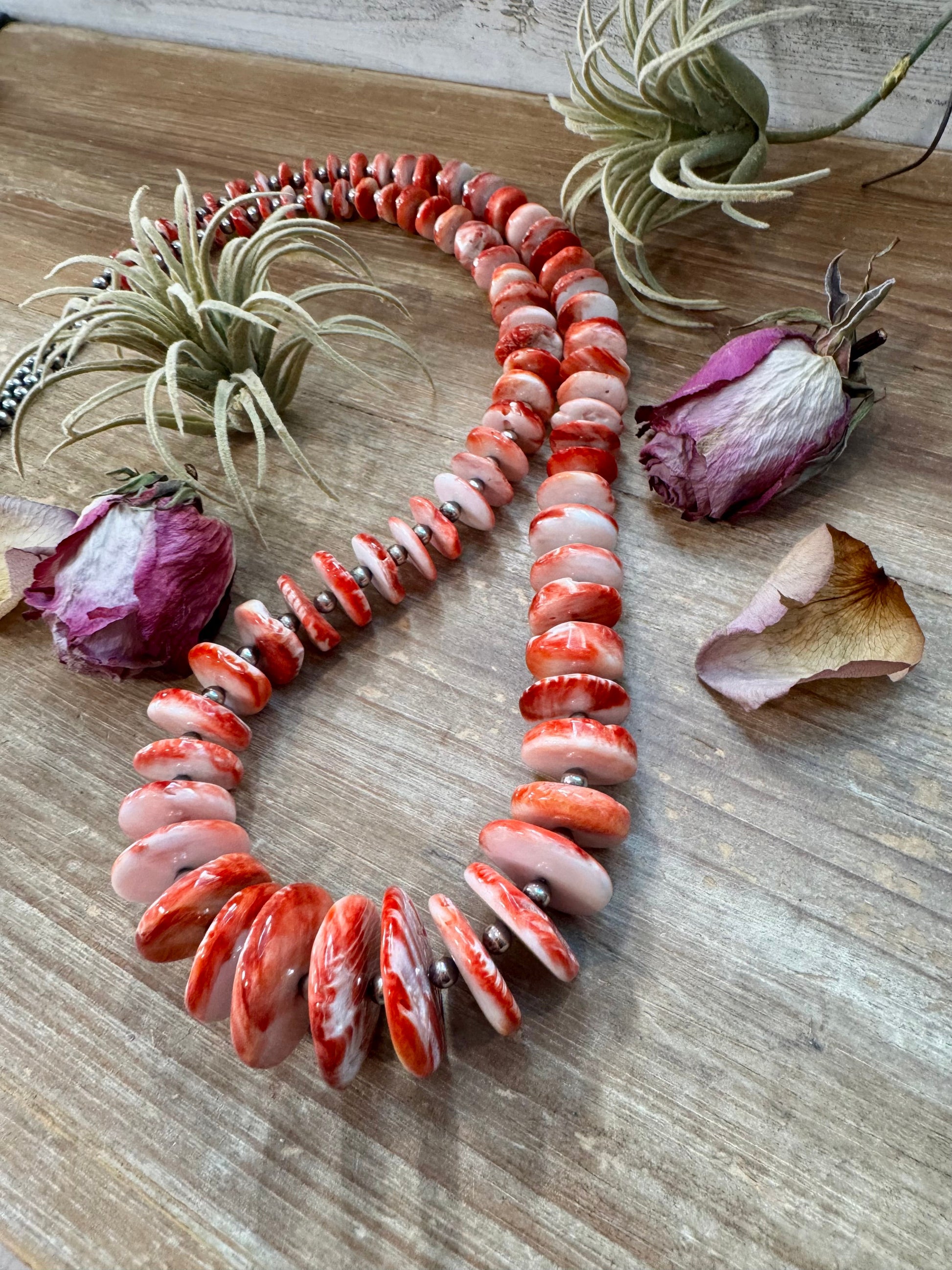 From our exclusive NFR Collection, this handcrafted necklace by The Bijoux FAB is a show-stopping statement of Western color and shine. Measuring 37 inches long, it features 5mm sterling silver pearls paired with graduated spiny oyster beads in rich orange and coral tones. Finished with a non-tarnish hook, this piece is lightweight yet visually striking — designed to turn heads and add warmth to any look. Only one was made.