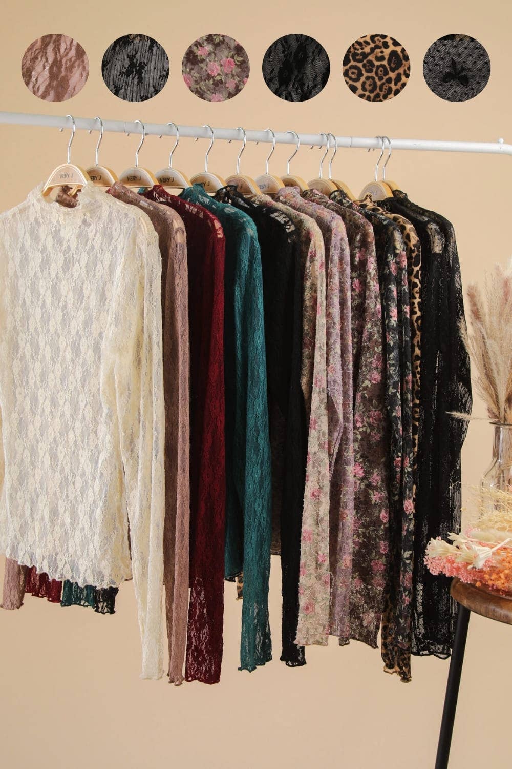 - High Neck Fitted Sheer Mesh Lace Knit Top