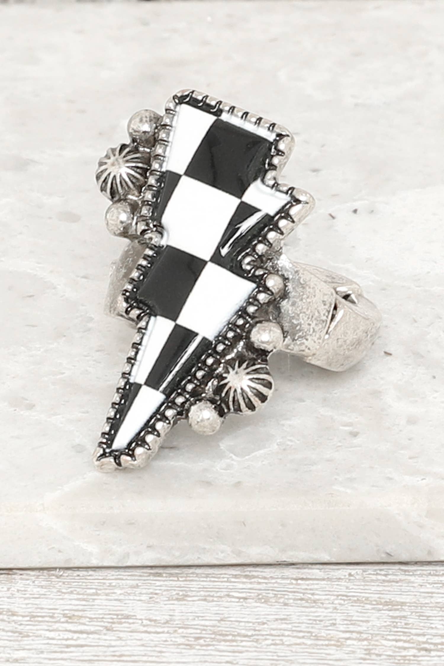 Introducing our Western Checker Board Pattern Thunder Ring, a stylish and unique addition to your jewelry collection. Made with high-quality materials, this ring features a bold checkerboard pattern that exudes confidence and adds a touch of Western flair to any outfit. Expertly crafted, this ring is sure to make a statement and stand the test of time. Perfect for the fashion-forward individual looking to make a statement.